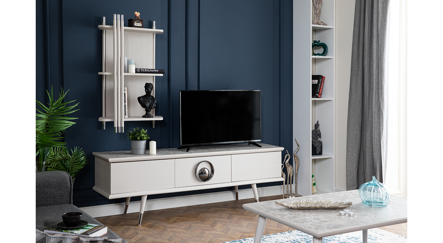 "Alaçatı duvar ünitesi, beyaz renk ve zirkon metal detayları ile modern bir tasarıma sahip. Minimalist çizgileri ve estetik görüntüsüyleevinize zarafet katacak!"