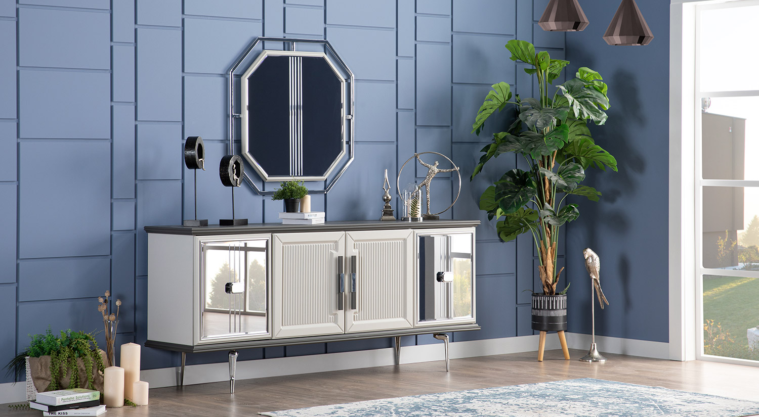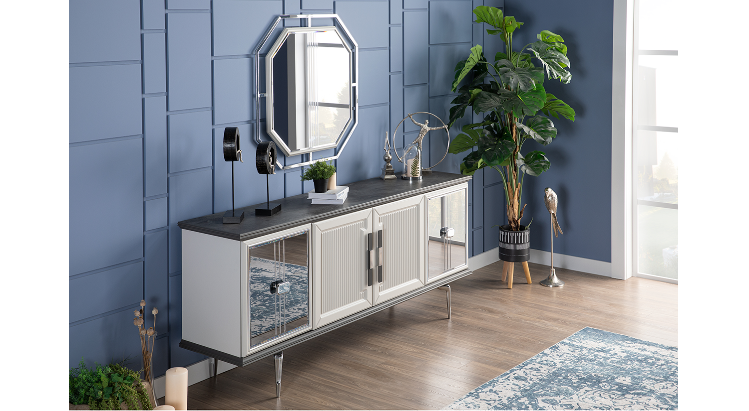 Konsol Malzemesi: Gövde melamin kaplı yonga levha, orta kapaklar ise boyalı Medium Density Fiberboard (MDF) malzemeden üretilmiştir. Sağ - sol kapakların etrafında PVC kaplı ahşap çerçeve profiller, ön yüzlerinde ise plastik sibu profil yer almaktadır. Alt - üst tablaların kenarlarında da PVC kaplı Medium Density Fiberboard (MDF) kullanılmıştır. Ayakları krom kaplı metaldir. Sağ - sol kapak kulpları krom kaplı metaldir, orta kapak kulpları ise füme kaplı metal profil ve krom kaplı gövdenin birlikte kullanılması ile üretilmiştir. Kapaklarda kendinden frenli menteşeler kullanılmışır. Ayna pano etrafında PVC kaplı ahşap çerçeve profiller yer alırken arkasında ise görsel amaçlı olarak, krom kaplamalı metal aksesuar mevcuttur ve çapraz kesimli parçalar yardımı ile duvara asılmaktadır.